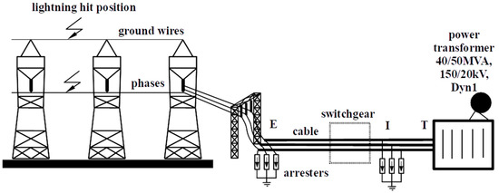 The design of the lightning protection system of high-voltage substations intends to limit the expected outages of substantial equipment of the substations due to lightning overvoltages. It is worth noting that in the case of gas-insulted substations, the severity of the potential consequences due to a lightning overvoltage is more intense, compared to air-insulated substations, considering the repair or/and replacement cost [2]. The combination of an external lightning protection system with surge arresters at the entrance of the substation is the common practice for the reduction of the lightning faults [3,4,5]. However, various factors influence the protection level and the effectiveness that the applied protective measures provide such as the lightning hit position, the length of the underground cables for the connection of the incoming transmission line and the transformer, the number and the placement of the surge arresters, the grounding resistance. These are parameters that determine the range of the arising surges and have a great impact on the lightning performance of the substations. In [6] the lightning performance of an air-insulated substation that connects a hydro power plant with network is presented, considering different overvoltage protection schemes. The influence of various parameters (i.e., surge front times, soil resistivity, distance of the cable that connects the transformer and the busbar) on the lightning performance of a combined overhead line/cable connected gas-insulated substation is examined in [7], since the role of the earth grid is revealed in [8]. Moreover, the adequate number and the appropriate placement of a surge arrester is also crucial in attempts to upgrade the lightning performance of the power substations [9,10,11,12].