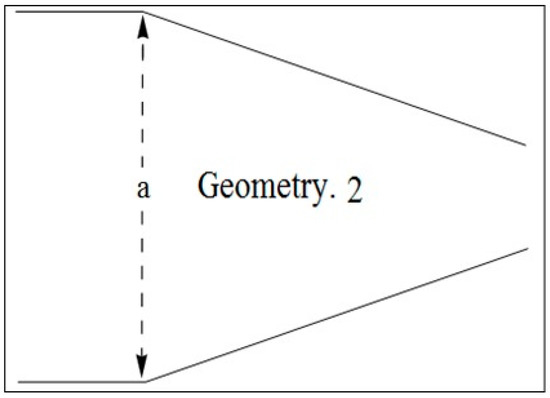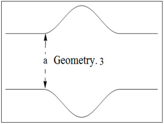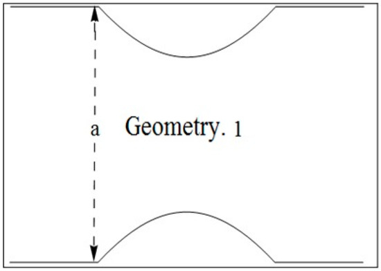 If —the velocity of a viscous, incompressible, steady, and electrically-conducting Newtonian fluid containing 40% hafnium (Hf) particles—the fluid flow is assumed to pass through three different types of symmetric channels, each of finite length “L”, respectively. A relation mathematically defining each channel along with the respective physical shapes as given below in Figure 1, Figure 2 and Figure 3: