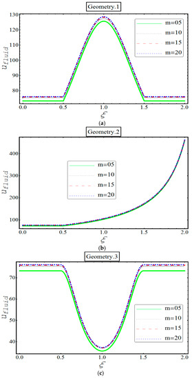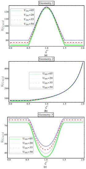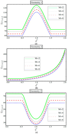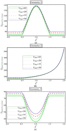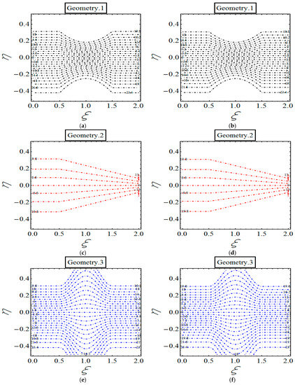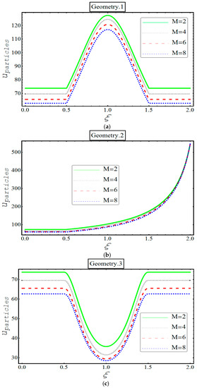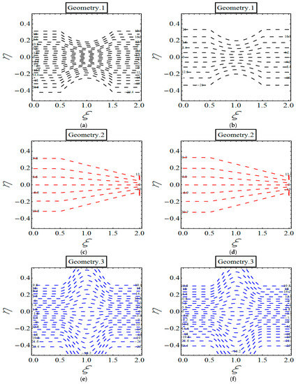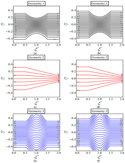 This portion describes the effects of significant parameters, namely Hartmann number , Helmholtz–Smoluchowski parameter and electro-osmotic parameter , in the presence of hafnium and water suspension in three diverse geometries under consideration. In Figure 4, Figure 5, Figure 6, Figure 7, Figure 8 and Figure 9, the velocities of fluid and hafnium particles are sketched for Hartmann number, Helmholtz–Smoluchowski parameter and electro-osmotic parameter for all three geometries. Due to diverse shapes and configurations, velocity behaves altogether differently. In the first two geometries, velocity of fluid particle suspension exhibits a rapid increase and it is because of Bernoulli’s principle of fluid dynamics whereas, the bulging out corrugation at the center of third geometry causes an opposite behavior in velocity as compared to the preceding geometries. Figure 4a–c, indicates the effects of Hartmann number on the velocity profile. A gradual reduction in fluid velocity that emerges corresponding to the Hartmann number is perceived. It is also observed that magnetic fields influence the motion of fluid transversely. It is not unexpected since the induced magnetic field is regarded as the force of hindrance; consequently, it does not permit the fluid to move with its full strength and speed. Figure 5a–c shows the influence of Hartmann number for paramagnetic order of hafnium particles. This figure illustrates that due to the paramagnetic order of hafnium particles along with magnetic susceptibility being greater than zero, the velocity of the particles resists and repels backward. It is mainly due to randomly oriented magnetic movements of the atoms. Figure 6a–c and Figure 7a–c are displayed to see the variation of the velocity for various values of electro-osmotic parameter. Unlike the Hartmann number, , the flow of fluid and particles is supported by electro-osmotic parameter, . It is understandable for first two geometries that the velocity of fluid particle suspension would make a rapid upturn in its momentum due to the shapes and configurations of said geometries. However, the velocity of both fluid and particles intensify in the third geometry, despite the bulging out corrugation at the center. This unique pattern of increase in velocity is induced by the electro-kinetic term present in Equation (27). Effects of velocity for fluid and particles are shown in Figure 8a–c and Figure 9a–c, respectively. It is noted that an increase in the velocity for fluid and particles subject to gear up the Helmholtz–Smoluchowski velocity . The variation in Helmholtz–Smoluchowski velocity results alike in all considered geometries regardless of their forms and configurations. One of the most significant features which describes the pattern of the fluid flow can be observed through stream lines. To serve this purpose, stream lines are displayed in Figure 10, Figure 11 and Figure 12 for different values of Hartmann number, , electro-osmotic parameter, , and Helmholtz–Smoluchowski velocity, . A virtually decline in velocities of both phases upon the rise in Hartmann number is a vivid indication of hindrance in the course of the flow. As the literature suggested that magnetic field lines resist any sort of fluid flow, therefore, increase in the Hartmann number causes the emergence of some additional stream lines in the geometry (1) and geometry (3) as shown in Figure 10a,b,e,f. On the other hand, the velocity of the fluid rapidly attains the utmost momentum for Geometry 2 as shown in Figure 10c,d. Thus the lines of magnetic fields only manage to compress the stream lines inwards. These graphs reveal the indicatives of reduction in the velocity of fluid–particle suspension. Furthermore, that the magnetic field lines act similar to resistance force is also verified. In Figure 11, stream lines are drawn against the electro-osmotic parameter. It is seen that the impact of the electro-osmotic parameter on stream lines varies in each geometry and features a different behavior altogether. For instance, reduction of stream lines upon the increase of electro-osmotic parameter as shown in Figure 11a,b, identifies that fluid currents get relaxed and find no difficulty making their way out with Geometry 1. It can also established by Figure 11c,d, in which space between every two stream lines has expanded. On the contrary, the electro-osmotic parameter remains effect less to alter stream lines in Geometry 3. It is because of the outward corrugation as specified in Figure 11e,f. To analyze the flow pattern for Helmholtz–Smoluchowski velocity, the stream lines are demonstrated in Figure 12a–f. It is revealed that stream lines do not alter upon varying . It is worth mentioning that all observations are in accordance with the physical expectations.