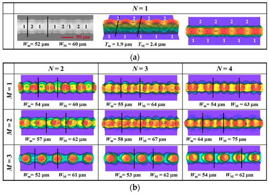 Figure 15 illustrates various printing modes of interlacing procedure. Each of the modes can be chosen for the improvement of geometrical characteristics of printed lines. Therefore, we investigated the change of the shape and morphology of intertwined printed lines with the modes by performing overprinting up to four times on S 50 substrate heated to 75 °C. The result is shown in Figure 16. The first layer (N = 1), a base layer for all the modes, was printed in the same manner as seen in Figure 11. It has an undulated surface profile with non-uniform thickness and bad edge sharpness, because of the multiple-pass printing nature of the interlacing procedure and the fast evaporation of the ink solvent (Figure 16a). The geometrical characteristics directly affected the following overprintings (Figure 16b,c). At N ≥ 2, the waved line edge became more prominent along with the N and hence, showed a considerable height variation across the line width for all of the printing modes. In the comparison of each mode, there was not observed a significant difference of a geometric profile between M1 and M2. However, relatively the former showed better line features than the latter, e.g., a narrower line width for the similar thickness variation. Unlike the two modes, M3 produced inkjet-printed lines with tooth-like configuration and moderating the boundary between each ink droplet. It is because the mode deposited ink droplets denser at the first pass of the overprinting, compared to the other two modes. Lastly the coffee ring effect was less developed in the interlacing printing procedure than the continuous printing procedure shown in Figure 12.