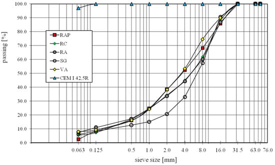 The experiment was designed to assign the samples of MCAS recycled mixtures to appropriate mix types in a series of tests using a single plot of the grading curve. Consequently, the basic mineral skeleton of the recycled mixture remained the same. Variables were the combinations of waste material proportions or mineral dust quantities. Note that the gradation of the reclaimed cement concrete (RC) and the reclaimed aggregate (RA) components was almost identical, which greatly facilitated interpretation of the test results. It should be added that the marginal material denoted as a mineral dust (derived from dedusting system by extraction of aggregates in the mine) in accordance to Polish standards and regulations was a waste material. The same inactive dusts were used and analyzed in paper [].