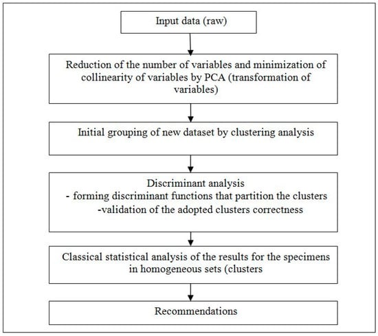 This procedure allows fulfilling the main assumption of canonical analysis required to discriminate sets with similarity of the set of features, unlike in the classical regression method, where the reference is made to one variable. For example, in the case of two mixtures with the same stiffness modulus, but with significantly different air void contents, stating their similarity in terms of durability would be incorrect. The purpose of the procedure used in this study was to eliminate relations of that kind in determining the suitability of a given waste material. The last element required before carrying out the correct multidimensional analysis on the set of recycled mixture results was to determine the initial number of sets. The tools in taxonomy were used []. It was necessary to initially group the set of objects (specimens) in such a way that the objects in the same group were similar to one another, but, to satisfy the separation property, different from the objects in other groups. In this case, a set of complex grouping algorithms was used. Among a number of available cluster algorithms, Ward’s method is based on the classical analysis of variance, which is to minimize the sum of squared distances from all points within the cluster []. As a result, we get a cluster with minimal data variation, which is important for analyzing the set of results obtained for recycled mixtures with waste materials and foamed bitumen. As a measure of group association, Pearson’s 1 − r coefficient (r—the Pearson correlation coefficient) was used. The algorithm of the whole process of inference is presented as a block diagram in Figure 2.