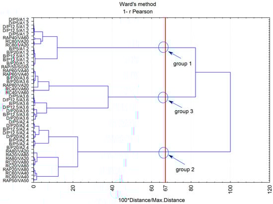 The vertical axis in Figure 3 shows every second case. The main intention was to present as many cases from the specific group as possible. On the basis of the agglomeration results (Figure 3) and using four variables (Z1 to Z4), three new groups were obtained, different in terms of physical and mechanical parameters. Their differentiation was very clear given the normalized distances between the clusters. The red line in Figure 3 cuts off a set of high internal similarity objects (clusters) but characterized by a great dissimilarity between one another. This information is important because the agglomeration can be the basis for assigning particular MCAS specimens. Finally, three groups were chosen for further analysis. Table 4 shows the types of MCAS recycled mixtures represented by the highest number of specimens in the given group.