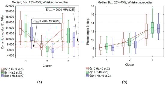 The number of freezing cycles for determining the resistance to moisture damage (WRW-2M) was established from the findings that the stiffness modulus reduced noticeably after 2 freezing cycles []. This test was performed to supplement the TSR test. The dynamic stiffness modulus (E*) was determined in the DTC-CY test to extend the analysis of classical results over the rheological properties of the recycled mixtures with waste materials, conducted at various temperatures and loading times. A possibility of applying sinusoidal load helped determine the phase angle (δ). The load was applied at frequencies: 0.1 Hz, 0.3 Hz, 1 Hz, 3 Hz, 10 Hz and 20 Hz. Test temperatures used were as follows: −7 °C, 5 °C, 13 °C, 25 °C and 40 °C. To comply with [,], where the stiffness of the recycled mixtures has to be evaluated in the IT-CY, the stiffness modulus was also determined using the DTC-CY method at a temperature of 5 °C and frequency of 10 Hz. All the requirements set forth in [] and those concerning ITS [] are represented in diagrams with respect to the clusters obtained.