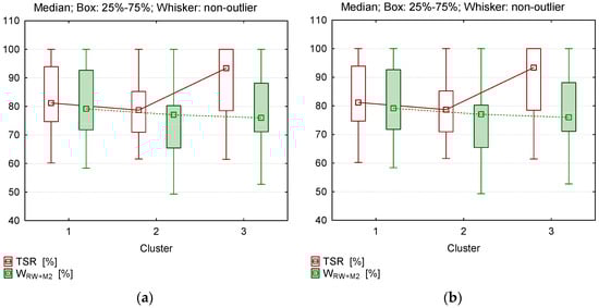 Another group of parameters whose levels were diversified with respect to clusters were the characteristics related to climatic factors (TSR and WRW + 2M) and indirect tensile strength (ITS) at 25 °C. The grouping results are illustrated in Figure 5.