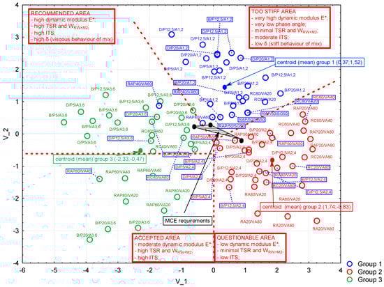 The limiting point of MCE results projection with respect to the space determined by the mixtures with waste materials were defined by maximizing each discriminant function. The value of each point within the polygon in Figure 7 was decoded with respect to the real parameters for the recycled mixtures (Table 9). Note that the mix with high air void content and low moisture resistance will be assigned, as a similar mixture, to Group 2, i.e., to questionable results from the perspective of the mix durability. For the mix to obtain the results similar to Group 3 (recommended), a larger amount of bitumen emulsion and cement will have to be used to improve its physical and mechanical parameters. The area of the results similar to Group 1 represents the mixtures with high cement content. The same results were observed in [].