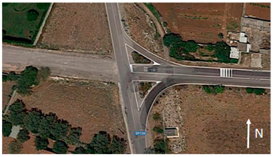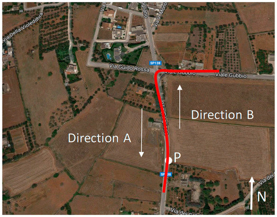 This type of traffic requires specific and accurate analyses of the traffic demand to serve, which affects the design of the appropriate geometric and structural features, and its control, to ensure regular and safe flows at road intersections. The demand analysis required a survey of traffic flows, to collect data on traffic volume and components. Each type of vehicle surveyed was classified by means of a traffic monitoring system. Traffic was surveyed for longer periods in the daytime. Monitoring (point P in Figure 2) involved both directions of the busiest arm, thus highlighting where highest traffic flows can be located (red in Figure 2).