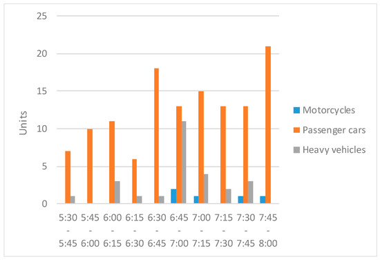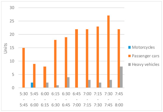 The analysis of traffic composition highlighted that volume of motorcycles is negligible, whereas heavy vehicles account for an average 15% of the total volume of passenger cars and heavy vehicles (Figure 3 and Figure 4). More specifically, heavy vehicles were 21% and 12% of total traffic respectively for directions A and B represented in Figure 2.