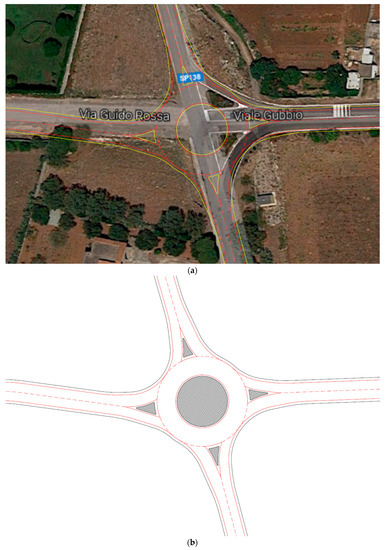 The survey reported flows of single unit or single trailer trucks, which required the study of their swept path envelopes, the larger of which due to 18 m long and 2.55 m wide vehicles. Moreover, the geometric configuration of the current junction and its comparison with the project (Figure 5a), its surrounding not-built area were additional constraints considered to design the counterclockwise roundabout (Figure 5b), according to the Italian standard for road intersection design [17].