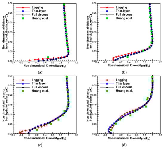 The reason why these predicted results among three different viscous flux treatment methods show quite different cavity structures can be identified from the velocity field around the hydrofoil. Figure 12, Figure 13 and Figure 14 compare the iso-contours of the predicted distributions of the stream-wise (x-direction) velocities, of the three different viscous models, during a single cycle. As reported in several previous studies [3,42,43,44], the re-entrant jet is the most critical mechanism causing unstable cavitation behavior. The re-entrant jet causes adverse velocity gradients on hydrofoil surfaces in a stream-wise direction, and then back-flow toward the leading edge occurs. This back-flow eventually breaks the cavity structures such that the most developed cavity structure is split into two, and the trailing edge cavities are shed downstream. As shown in the Figure 12, Figure 13 and Figure 14, re-entrant jet phenomena can be seen in the suction side of hydrofoil. In order to compare the strength of re-entrant jet for three viscous cases, the time-averaged x-directional velocity profile is examined. Figure 15 shows the distribution of time-averaged x-direction velocities at different locations for the three viscous cases. As can be seen in Figure 15, all three cases exhibit similar velocity profiles, and velocity values, at the outer cavity region. However, in the inner cavity region, the profiles differ significantly.