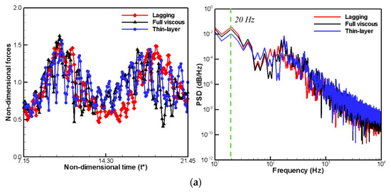 In the case of dipolar noise source components, the thin-layer and full viscous cases exhibit approximately the same SPLs, but the viscous lagging approach has the lowest SPLs, except at azimuth angles of 350° and 170°. These results are related to the variation of hydro-dynamic forces. As shown in Figure 4, the viscous lagging approach exhibits lower spectral magnitudes across the entire frequency range for the lift force, and f ≥200 Hz for the drag force. Therefore, compared to the thin layer and full viscous methods, smaller SPLs are observed at the locations where the lift forces are dominant, whereas larger SPLs are predicted at the locations where the drag forces are dominant (azimuth angles of 350° and 170°). However, the overall SPL directivity, and the predicted spectrum, of the thin layer approach closely follow those of the full viscous method.