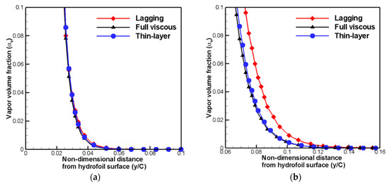 Figure 10 represent the comparison of time-averaged vapor volume fraction distribution at five different stream-wise locations for three different viscous flux vector treatment methods. As shown in Figure 10, most of cavity structures are developed near the hydrofoil surfaces, and above the there exist no cavities. When the homogeneous mixture approach is applied, the fluid existed in mixture phase. Therefore, it is hard to distinguish the boundary between liquid water and water vapor. Usually, the range of vapor volume fraction of is considered as water vapor phase. Therefore, the locations where the vapor volume fraction, , is equal to 0.05 can be as the boundary of developed cavity. Furthermore, the corresponding values of distance from the hydrofoil surface to the values of can be as the developed cavity thickness. Based on these points of view, to examine the effects of viscous flux vector treatment methods on developed cavity distributions and thickness in detail, zoomed vapor volume fraction distribution is compared as shown in Figure 11. The viscous lagging approach shows different results of vapor volume fraction distributions compared to the full viscous method and thin-layer approximation, except for the location of x/C = 0.2. Because complex flow phenomena such as separation did not occur at the leading edge, the effects of viscous flux vectors are relatively weak in this location. On the other hand, the full viscous method and thin-layer approximation show almost the same results for the location below the x/C = 0.6. For the locations of x/C = 0.8 and x/C = 1.0, thin-layer approximation shows a little lower values of cavity thickness.