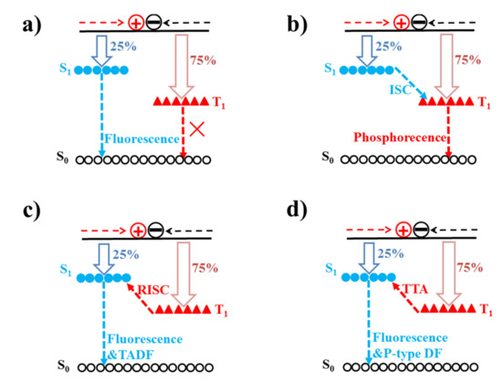 Exciton energy diagram and the possible decay ways of singlet and triplet excitons. Emissions from conventional fluorescent emitters (a); phosphorescent emitters (b); TADF emitters(c) and TTA based emitters (d). Reproduced with permission from [42].