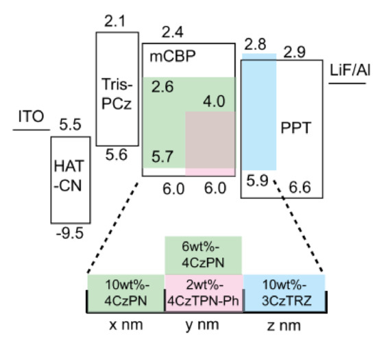 In 2014, Adachi et al. used this approach to realize high-efficiency TADF WOLED [46]. Figure 2 depicts the device structure: ITO/1,4,5,8,9,11-hexaazatriphenylene hexacarbonitrile (HAT-CN, 10 nm)/9,9′,9′′-triphenyl-9H,9′H,9′′H-3,3′:6′,3′′-tercarbazole (Tris-PCz, 35 nm)/10 wt. % 1,2,3,4-tetrakis(carbazol-9-yl)-5,6-dicyanobenzene (4CzPN): 3,3-Di(9H-carbazol-9-yl)biphenyl (mCBP, green EML) (x nm)/6 wt. % 4CzPN: 2 wt. % 41,4-dicyano-2,3,5,6-tetrakis (3,6-diphenylcarbazol-9-yl)benzene (CzTPN-Ph): mCBP (red EML) (y nm)/10 wt. % 9-(3-(9H-carbazol-9-yl)-9-(4-(4,6-diphenyl-1,3,5-triazin-2-yl)phenyl)-9H-carbazol-6-yl)-9H-carbazole (3CzTRZ): 2,8-bis(diphenylphosphoryl) dibenzo-[b,d] thiophene (PPT, blue EML) (z nm)/PPT (50 nm)/LiF/Al. In this device, the T1 level of mCBP host is 2.9 eV, which is much higher than that of blue, green and red TADF emitters, ensuring the high efficiency. Besides, PPT has a high T1 of 3.1 eV, suggesting a good confinement of the triplet excitons. By optimizing the charge generation zone via the adjustment of different EML thickness (the total thickness is set to be x + y + z = 15 nm), the WOLED achieved a maximum EQE of over 17%, a peak PE of 34.1 lm/W with CIE coordinates of (0.30, 0.38).