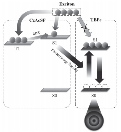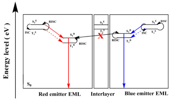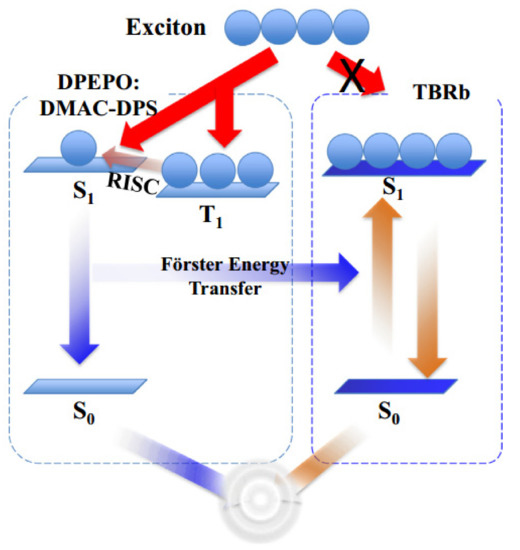 In 2015, Higuchi et al. demonstrated this approach by using blue TADF emitter bis[4-(9,9-dimethyl-9,10-dihydroacridine)phenyl]sulfone (DMACDPS) with green fluorescent emitter 9,10-bis[N,N-di-(p-tolyl)-amino]anthracene (TTPA) and red emitter tetraphenyldibenzoperiflanthene (DBP), achieving a maximum EQE of 12% [126]. The device structure is ITO/N,N′-di(naphthalen-1-yl)-N,N′-diphenyl-benzidine (α-NPD, 30 nm)/1 wt. % DBP: 10 wt. % TTPA: 1,3-bis(9-carbazolyl) benzene (mCP, 8 nm)/mCP (2 nm)/DMACDPS (7.5 nm)/bis[2-(diphenylphosphino)phenyl]ether oxide (DPEPO, 10 nm)/2,2′,2′′-(1,3,5-benzinetriyl)-tris(1-phenyl-1-H-benzimidazole) (TPBi, 40 nm)/LiF (0.5 nm)/Al (100 nm). The high performance can be explained as follows. (i) There is a large spectral overlap between the ground state absorption of the exciton acceptor and fluorescent emission of the exciton donor, indicating that the energy of singlet excitons, i.e., Förster energy transfer, up-converted from a triplet state on a TADF molecule can be efficiently transferred to the fluorescent exciton acceptors; (ii) A large LUMO energy barrier is presented at the mCP/DMACDPS interface, leading to the carrier recombination mainly occurring on DMACDPS molecules for blue emission; (iii) 2 nm spacer mCP is used to eliminate the direct carrier recombination on fluorescent molecules and produce delayed emission from the fluorescent molecules. As a consequence, the exciton donor and acceptor molecules are separated into different layers, because Förster energy transfer involves long-range interactions; (iv) The cascade energy transfer occurs from S1 of DMACDPS to S1 of DBP through S1 of TTPA, in which controlling the TTPA concentration can tune the spectrum by influencing the amount of energy absorbed from DMACDPS and the rate of Förster energy transfer to DBP, as shown in Figure 4.