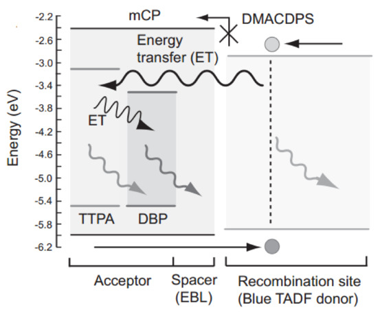 Schematic illustrations of a conceptual energy transfer mechanism from DMACDPS (common blue TADF emitter) to TTPA and DBP under electrical excitation. Reproduced with permission from [126], John Wiley and Sons, 2015.