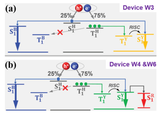 Device function mechanisms of the conceptual utilization of singlet and triplet excitons generated in EMLs. (a) device W3; and (b) devices W4 and W6. H, B, Y and R are CBP, NI-1-PhTPA, PXZDSO2 and DBP, respectively. Reproduced with permission from [56], John Wiley and Sons, 2016.