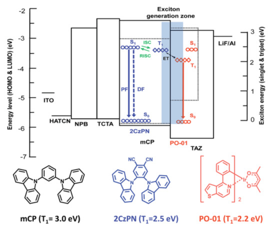 Zhang et al. reported the first hybrid WOLEDs by using blue TADF materials, achieving a maximum forward-viewing PE of 47.6 lm/W [142]. The device structure is ITO/HATCN (5 nm)/NPB (40 nm)/TCTA (10 nm)/mCP: 4,5-bis(carbazol-9-yl)-1,2-dicyanobenzene (2CzPN, 11 nm, blue EML)/3-(4-biphenyl)-4-phenyl-5-(4-tert-butylphenyl)-1,2,4-triazole (TAZ): 4 wt. % (acetylacetonato)bis[2-(thieno[3,2-c] yridine-4-yl)phenyl]iridium(III) (PO-01, 4 nm, orange EML)/TAZ (40 nm)/LiF (0.5 nm)/Al (150 nm), as shown in Figure 9. The factors for the high performance: (i) mCP is chosen to be the host for 2CzPN due to the wide energy gap and high T1 of 3.0 eV, since the host of the TADF material plays an important role in determining the efficiency; (ii) 2CzPN is placed nearest to the main recombination zone, ensuring that excitons can diffuse throughout the emissive region to produce a desired color-balanced output; (iii) triplets formed on 2CzPN can be harvested by either energy transfer to the low-lying triplet states of the phosphor PO-01 (2.2 eV) or thermal upconversion to the emissive singlet states, eliminating the energy loss; (iv) the recombination zone is fixed as the voltage increases by 2CzPN due to its charge trapping ability, achieving stable white emission.