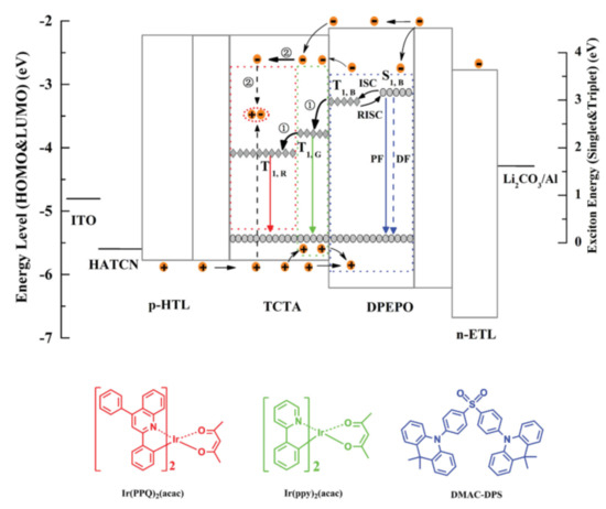 Proposed energy level diagram of the WOLED and chemical structures of emitters. R, G and B represent Ir(PPQ)2(acac), Ir(ppy)2(acac) and DMAC-DPS, respectively. Solid and dashed lines refer to HOMO and LUMO energy levels; circles and diamonds correspond to the exciton energies (S0, S1 and T1), respectively. ① presents the energy transfer process and ② is the carrier trapping process. PF is the prompt fluorescence, DF is the delayed fluorescence. Reproduced with permission from [154], John Wiley and Sons, 2016.