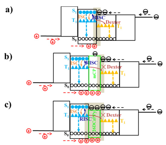 For example, Li et al. reported high-efficiency and high CRI WOLEDs with the chromaticity-adjustable yellow TADF emitter 2-(4-phenoxazinephenyl)thianthrene-9,9′,10,10′-tetraoxide (PXZDSO2) [56]. By combining the conventional deep-blue fluorescence emitter NI-1-PhTPA and PXZDSO2, the two-color WOLED showed a maximum EQE of 15.8% (device W3). Then, since the chromaticity of the EML containing PXZDSO2 could be tuned to yellowish green, they introduced a deep-red-fluorescence emitter DBP (dibenzo{[f,f′]-4,4′,7,7′-tetraphenyl}diindeno [1,2,3-cd:1′,2′,3′-lm]perylene) subtly to fabricate three-color WOLED, achieving the most efficient ever EQE of 19.2% with CRI of 68 (device W4) and the highest ever CRI of 95 with EQE of 15.6% (device W6). The configurations are ITO/hexaazatriphenylene hexacarbonitrile (HATCN)/TAPC/EMLs/TmPyPB/LiF/Al, in which device W3 has the EML of CBP: 8 wt. % NI-1-PhTPA (10 nm)/CBP (3 nm)/CBP: 6 wt. % PXZDSO2 (15 nm)/CBP (3 nm)/CBP: 8 wt. % NI-1-PhTPA (10 nm), device W4 has the EML of CBP: 7 wt. % NI-1-PhTPA (10 nm)/CBP (3 nm)/CBP: 3 wt. % PXZDSO2 (5 nm)/CBP: 5 wt. % PXZDSO2: 0.3 wt. % DBP (5 nm)/CBP: 3 wt. % PXZDSO2 (5 nm)/CBP (3 nm)/CBP: 7 wt. % NI-1-PhTPA (10 nm), device W6 has the EML of CBP: 10 wt. % NI-1-PhTPA (10 nm)/CBP (3 nm)/CBP: 5 wt.% PXZDSO2: 0.35 wt. % DBP (15 nm)/CBP (3 nm)/CBP: 10 wt. % NI-1-PhTPA (10 nm). The device working mechanisms can be described as follows. For device W3, (i) since NI-1-PhTPA is a deep-blue-fluorescence emitter and CBP: 6 wt. % PXZDSO2 emit yellow light with broad spectrum, high-performance two-color WOLEDs were realized; (ii) given the almost equal T1 level of NI-1-PhTPA and PXZDSO2, the efficiency roll-off occurs if they are directly contact due to the triplet exciton quenching by NI-1-PhTPA; (iii) the efficiency roll-off can be further induced as the formed triplet excitons of NI-1-PhTPA cannot be utilized by PXZDSO2; (iv) to stabilize the recombination zone which occurs in whole EMLs since NI-1-PhTPA/CBP are bipolar and avoid triplet exciton quenching by NI-1-PhTPA, two 3 nm CBP were inserted between the blue and yellow EMLs, restraining the inevitable Förster energy transfer from NI-1-PhTPA to PXZDSO2; (v) to reduce the triplet exciton energy loss via nonradiative transition process, blue-fluorescence emitter was dispersed in CBP for blue emission, leading to most excitons being generated at CBP; (vi) triplet energy transferred from CBP gives most of triplet excitons of PXZDSO2 since triplet excitons typically have long diffusion lengths (≈100 nm), as shown in Figure 5a. Hence, an EQE of 15.8% was achieved for device W3. For device W4, (i) a deep-red-fluorescence emitter DBP was conceived to be used; (ii) PXZDSO2 was an assistant host for DBP to realize red light emission due to efficient energy transfer from the S1 of PXZDSO2; (iii) the doping concentration of PXZDSO2 was decreased to reduce intermolecular aggregation and thus blue shifted emission (20 nm), achieving green emission, complementary to emissions of NI-1-PhTPA and DBP; (iv) a red EML of CBP: 5 wt. % PXZDSO2: 0.3 wt. % DBP was inserted between two green EMLs of CBP: 3 wt. % PXZDSO2 to receive singlet exciton energy transferred from the PXZDSO2 molecules in both sides to give both green and red emissions; (v) the two doped blue EMLs and CBP interlayers located at the both sides of the green EMLs to give blue emission and to confine the PXZDSO2 triplet excitons, respectively, as shown in Figure 5b. Thus, an EQE of 19.2% was achieved for device W4. Furthermore, an EML consisting of improved DBP doping concentration was utilized instead of the green and red EMLs for candle-style warm WOLEDs (device W6), achieving the high CRI of 95.
