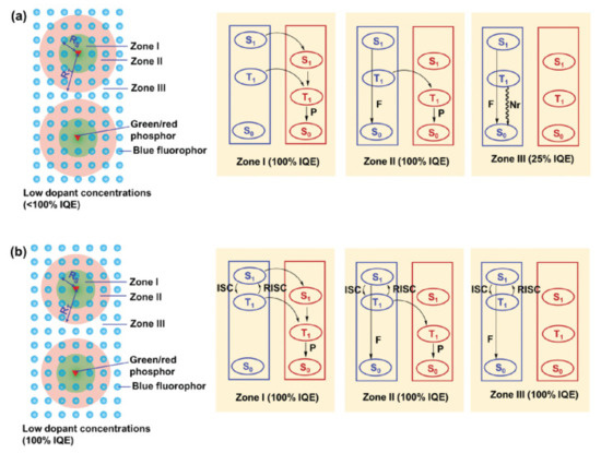 Liu et al. reported a single-EML hybrid WOLED by using a blue TADF exciplex CDBP: 50 wt. % PO-T2T, achieving the forward-viewing EQE of 25.5% and PE of 84.1 lm W−1 [162]. The device structure is ITO/TAPC (30 nm)/CDBP (10 nm)/CDBP: 50 wt. % PO-T2T: 0.1 wt. % Ir(ppy)2acac: 0.3 wt. % bis(2-methyldibenzo [f,h]quinoxaline)(acetylacetonate)iridium (III) (Ir(MDQ)2acac, 30 nm)/PO-T2T (40 nm)/LiF (1 nm)/Al (100 nm). The emission mechanism of this device can be explained as follows. A system with low green/red phosphorescent dopants and conventional blue fluorescent host molecules is shown in Figure 13a. In Zone I, both singlets and triplets of the blue host can transfer energy to dopants, giving theoretically 100% IQE emission from dopant. In Zone II, only triplets of the host can reach the dopant due to the different diffusion length of singlets and triplets. In this case, blue emission from the host and green/red emission from dopant can be obtained with theoretically 100% IQE. In Zone III, no exciton from the host can reach the dopant, giving only blue emission with an IQE of 25%. Therefore, 100% IQE white emission can only be achieved in Zone II but with warm-white emission, while the white balance can be maintained in Zone III but with 25% IQE. These issues can be effectively addressed by using a blue TADF host, as shown in Figure 13b. For this system, both singlet and triplet excitons in Zone III can be harvested for blue emission with a theoretical 100% IQE. Thus, a TADF host-phosphor dopant WOLED can simultaneously achieve 100% IQE and white emission even with extremely low dopant concentrations. Besides, due to the extremely small ΔEST, blue TADF emitters intrinsically have T1s higher than those of the green phosphors.