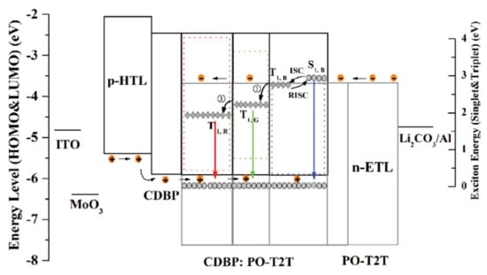 To simplify the device architecture, single-EML WOLEDs based on blue TADF and phosphorescence have been reported. For example, Song et al. codoped a blue TADF emitter and a yellow phosphorescent emitter into a fluorescent host, achieving the WOLED with a maximum EQE of 22.4% and PE of 60.3 lm W−1 [156]. The device structure is ITO (120 nm)/PEDOT:PSS (60 nm)/TAPC (20 nm)/mCP (10 nm)/DPEPO: 50% DMAC-DPS: 0.3% PO-01 (25 nm)/TSPO1 (5 nm)/TPBI (30 nm)/LiF (1nm)/Al (200 nm). The emission mechanism of this single-EML WOLED can be described as follows. (i) Due to the low concentration of PO-01 (0.3%), the direct charge trapping is not the main emission process of PO-01 to generate yellow emission; (ii) The energy can be directly transferred from DPEPO to PO-01 or from the singlet and triplet excitons of DMAC-DPS to PO-01, producing the yellow emission; (iii) The energy can be transferred from the singlet excitons of DMAC-DPS generated by the RISC of the triplet excitons of DMAC-DPS to PO-01. Therefore, both the original singlet excitons and up-converted singlet excitons of DMAC-DPS transfer emission energy to PO-01 for white emission, as shown in Figure 4.