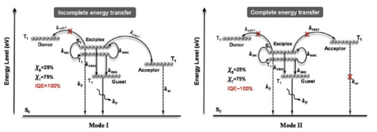 Wu et al. reported a single-EML WOLED by using donor mCP and acceptor 4,6-bis[3,5-(dipyrid-4-yl)phenyl]-2-methylpyrimidine (B4PyMPM) as the TADF exciplex host of phosphorescence dopants, obtaining a maximum forward-viewing EQE of 28.1% and PE of 105.0 lm W−1 [36]. The configuration is ITO (110 nm)/TAPC (40 nm)/TCTA (10 nm)/mCP (10 nm)/mCP: 50 wt. % B4PyMPM: 15 wt. % bis(3,5-diuoro-2-(2-pyridyl)phenyl-(2-carboxypyridyl) iridium III (FIrpic): 0.2 wt. % PO-01 (20 nm)/B4PyMPM (50 nm)/Liq (0.8 nm)/Al (120 nm). The high performance can be explained as follows. (i) The exciplex was exclusively as the host and at the same time codoped it with two-color phosphors, prohibiting the shortcomings of low efficiency and pronounced efficiency roll-off; (ii) By using energy level matching hole and electron transporting layer, the structural heterogeneity is reduced. Besides, high hole mobility of mCP (5 × 10−4 cm2 V−1 s−1) and electron mobility of B4PyMPM (1 × 10−4 cm2 V−1 s−1) are used, realizing low voltages (e.g., 1 cd m−2 at 2.5 V); (iii) The perfectly confined excitons fully eliminate the exciton leakage from the emission zone, enhancing the efficacy. As shown in Figure 15 left, if acceptor molecules with low T1, part of excitons from the exciton formation zone will be trapped by the acceptor (transfer mode I). Hence, excitons transferred to the acceptor molecules would decay via a nonradiative path owing to their rather low photoluminescence quantum yields, thereby causing undesirable exciton leakage and accordingly low efficiency. As shown in Figure 15 right, if acceptor molecules with high T1, the leakage phenomenon is suppressed (transfer mode II). Hence, all excitons are transferred only to the emitter molecules via either long-range dipole-dipole coupling (Förster energy transfer) or short-range exchange interaction (Dexter energy transfer). Thus, the emitter molecules can utilize all excitons and consequently deliver a 100% IQE.