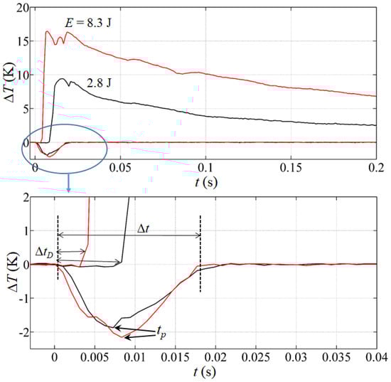 | E (J) | Ah (mm2) | E/Ah (J/mm2) | ∆TMin (K) | ∆TMax (K) | ∆t (s) | ∆tD (s) | tp (s) |