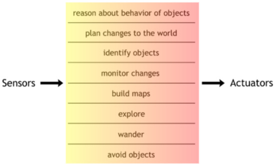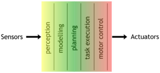 Figure 2 shows an example of a hierarchical paradigm characterized by a horizontal decomposition as summarized by Rodney Brooks in [19]. The first module consists in collecting and processing the environmental data received through the robot’s sensors. The processed data are used to either construct or update an internal world model. The model is usually constituted by a set of symbols composed by predicates and values that can be manipulated by a logical system. The third module, i.e., the planner, uses the world model and the current perception to decide a feasible plan of actions to be executed to achieve the desired goal. Once a suitable set of actions has been found, the fourth and fifth modules execute the actions by converting the high-level commands into low-level commands to control the actuators of the robot. This process is repeated continuously until the main goal of the robot has been achieved.