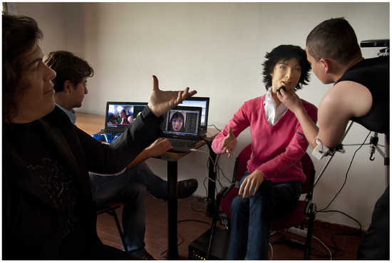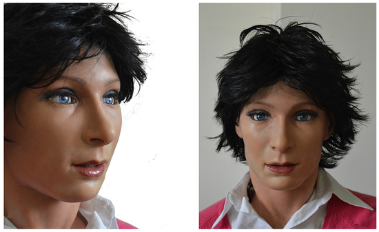 The FACE (Facial Automaton for Conveying Emotions) robot is a humanoid robot endowed with a believable facial display system based on biomimetic engineering principles and equipped with a passive articulated body [27]. The latest prototype of the FACE robot’s head has been fabricated by David Hanson (http://www.hansonrobotics.com/) through a life-casting technique. It aesthetically represents a copy of the head of a female subject, both in shape and texture, and the final result appears extremely realistic (Figure 6). The FACE actuation system is based on 32 electric servo motors, which are integrated into the skull and the upper torso mimicking the major facial muscles. Movements of the facial expressions are very responsive with no noticeable latency because the system fully exploits the hardware limitations of the control boards (i.e., 3 Pololu Mini Maestro 12-Channel USB Servo Controllers (https://www.pololu.com/product/1352)). Thanks to the physical and mechanical characteristics of the materials, The FACE robot is able to reproduce a full range of realistic human facial expressions [28].