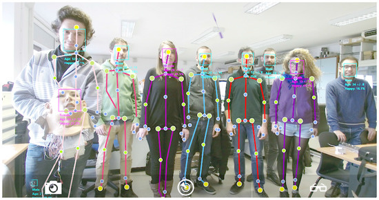 The FACE scene analyzing system is tracking interlocutors at the “Enrico Piaggio” Research Center (University of Pisa, Italy). Faces are recognized and highlighted with squares (blue for male; pink for female) together with social information, e.g., estimated age and facial expression. Body skeletons of the six closest subjects are also highlighted with lines linking their joint coordinates.