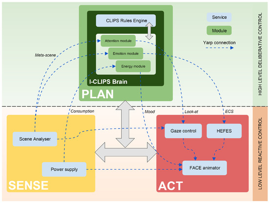 - [R. 4] a deliberative reasoning high-level architecture aimed at implementing the robot’s behavioral and emotional models;
