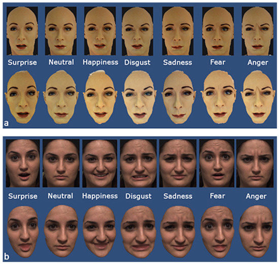 The 2D photos and 3D models used in the experiment: (a) FACE robot expressions and (b) human expressions.