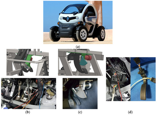 Automation of driving elements. (a) Renault Twizy; (b) steering modification; (c) braking system modification; (d) throttle modification.