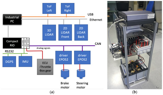 The aforementioned platform is based on an electric commercial vehicle—Renault Twizy—that has been conveniently modified in order to meet the specifications mentioned above. The modifications compound the low label architecture and include: (a) automation of driving elements (throttle, brake, steering, gearbox); (b) installation of external anchors capable of holding a wide variety of sensors; (c) installation of interior racks to accommodate the different control and processing systems (Figure 2b); (d) installation of electrical facilities and communication buses to feed and connect the different sensors and the control and processing hardware.