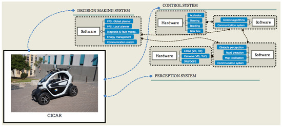 From a higher abstraction layer point of view, the architecture of the CICar is divided into: (1) a control system, (2) a perception system, and (3) a decision-making system. Figure 3 shows the distribution of the high-level architecture components of the CICar.