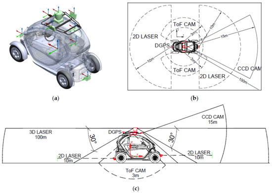 (a) CICar 3D model with reference frames; (b,c) plant and side views of the perception system ranges and components.