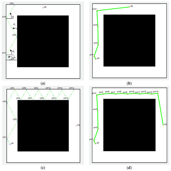Example of the Search for Cross Points (SCP) working between p0 and pg with initial angle θ0 = 60°. (a) Scenario without change of direction; (b) Obtained trajectory in scenario without change of direction; (c) Scenario with change of direction; (d) Obtained trajectory in scenario with change of direction.