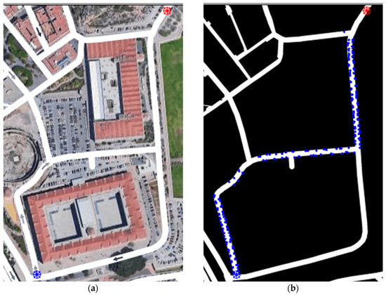 The first algorithm evaluated for global route generation was the A* Algorithm [34,35]. The following disadvantage was reported with the use of the A* algorithm: the algorithm was not capable of generating routes in a reasonable time using the 512 × 512 resolution binary maps tested. To increase the performance, the size of the binary maps was reduced by a constant factor (2, 3, or 4). The size reduction of the binary map speeded up the calculation time, but, because of the pixelisation effects, the following problems occurred: (1) the destruction of narrow roads, (2) the deterioration of main roads, and, as a result, (3) the routes generated were not smooth and were very abrupt.