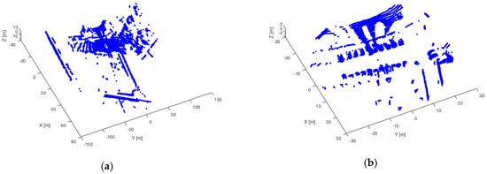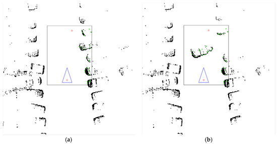 After this, the corners of the objects in the scene are computed using the Harris algorithm [36]. The Harris algorithm is applied over an ROI (Region of Interest) in the forward direction of the vehicle. Figure 9 shows the results of corner detection in the ROI of two scenarios extracted from Figure 9b. This group of points calculated by the Harris algorithm are called keypoints (KPi) and will be used in the next stage of the PPS to create a set of trajectories.