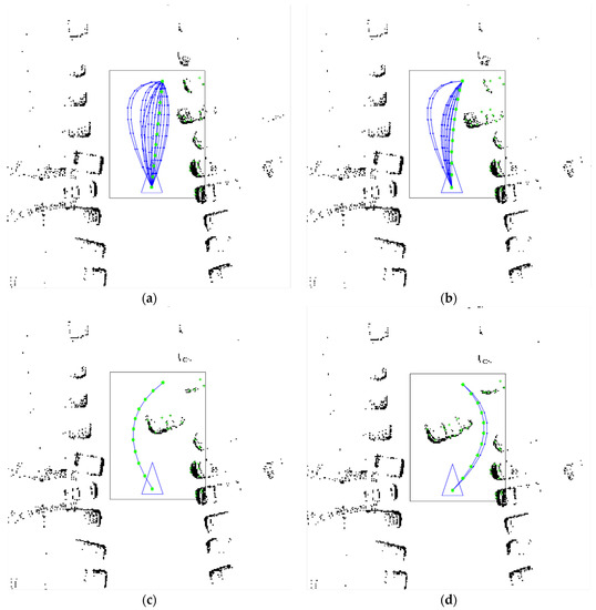 (a) Scenario 1 (nCurves = 30, safety distance = 1 m, criteria = maximum angle); (b) scenario 1 (nCurves = 30, safety distance = 1 m, criteria = medium trajectory); (c) scenario 4 (nCurves = 25, safety distance = 1 m, criteria = minimum distance); (d) scenario 4 (nCurves = 25, safety distance = 0.5 m, criteria = minimum distance).