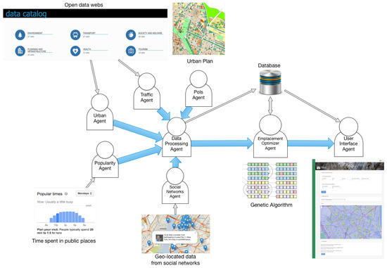 The proposed MAS follows the next phases: (1) extraction of the set of points of interest (PoIs) of the city P and their characterization considering different sources of information; (2) application of the genetic algorithm according to the conditions defined by the problem to be treated; and (3) visualization of the results.