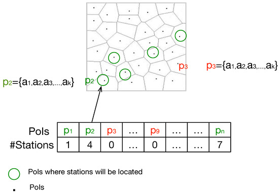 The problem consists of the location of a set of charging stations starting from a set of PoIs of the city under study. In this way, is a set of possible locations for charging stations (PoIs), and is the set of charging stations that are going to be finally deployed in the city, with values ranging from 0 to a constant value of charging stations per PoI. A PoI is characterized by a set of attributes that define it, :