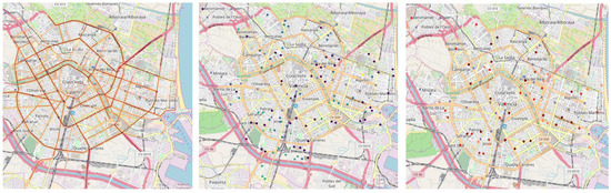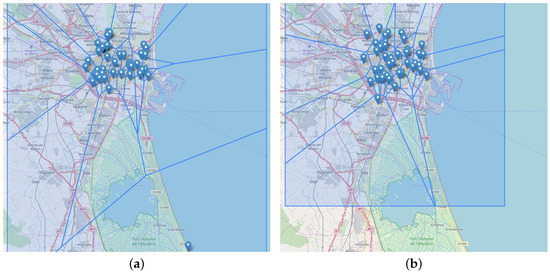 Finally, we show two specific results of the genetic algorithm for the particular case study of Valencia in order to compare solutions of different quality. Our goal is to analyze how accurate a solution with a high fitness value is compared to another with lower value. In this way, Figure 9 represents two computed solutions with our genetic algorithm. Figure 9a is a solution computed with an initial population of 250 and a fitness value of . The solution of Figure 9b is computed with an initial population of 4000 that yields a fitness value of . Both fitness values are close. However, as we showed in the analysis of Figure 6, there is a significant difference between the fitness values obtained.