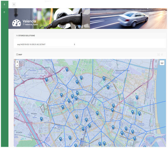 In the third phase, polygons and their characteristics represented by the extracted data are considered in order to obtain a solution by means of the Emplacement Optimizer Agent through the proposed genetic algorithm. The number of stations and the time needed to find a solution are constraints of the problem. The weights that we use to balance out the attributes of each PoI in Valencia are: for the population around the PoI; for the average traffic around the PoI; for the average time spent in public places of the area; and for the geo-located social networking activity in the area. Once the genetic algorithm finishes, the best individual (i.e., configuration of EV charging stations) in the population is provided based on the value provided by the function of fitness presented in Equation (1). An example of a solution given by the User Interface Agent in which the locations where each charge point would be located is shown in Figure 5.
