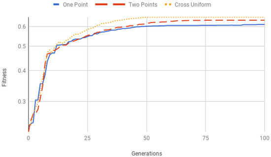 We also tested different crossover techniques of the genetic algorithm. Specifically, we tested the single point technique in which a single crossover point is selected and all data of the parents is swapped from that point; the two points technique, where two points of the chromosomes are selected and everything between these two points is swapped between the parents; and the cross uniform technique, that uses a fixed mixing ratio between the two parents and parents’ genes are swapped instead of segments of genes.