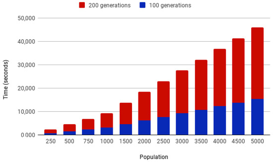 Figure 8 presents the computation time in seconds (all the tests were conducted on a single machine with an Intel Core i7-3770 CPU at 3.40 GHz and 8 GB RAM) for different initial populations of the genetic algorithm for 100 and 200 generations in our scenario. Each bar is calculated with the mean of five different executions of the genetic algorithm with the specified parameters. The computation time increases linearly with the population and generations. In this way, the computation times for 200 generations are approximately the double of the computation times for 100 generations.