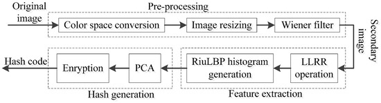 In order to achieve a good balance between discriminability and robustness, a new PIH scheme is proposed in this paper by combining LLRR and LBP features (called LLRR-RiuLBP). In the proposed scheme, LLRR is first employed in order to obtain the principal and salient components of the original images, considering its robustness of salient feature extraction to corrupted data; following this, the RiuLBP feature extraction is applied to the principal and salient components and generates the perceptual hash. The proposed PIH scheme consists of three main stages: pre-processing, feature extraction, and hash generation. The block diagram of the proposed image hashing scheme is shown in Figure 1, and the whole hash generation process is depicted as follows.