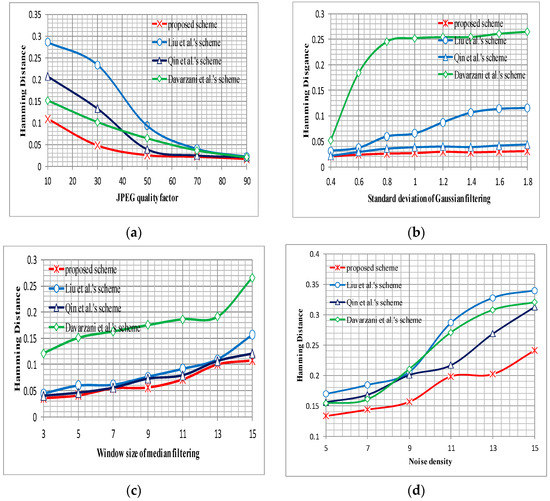 It can be seen that the average normalized Hamming distance of the proposed scheme (LLRR-RuiLBP) is less than Liu et al.’s and Qin et al.’s methods. That is to say, our PIH scheme is more robust to content-preserving attacks than existing schemes [13,24,26]. This is partly because the LLRR adopted in the proposed scheme can effectively extract principle features from corrupted data.