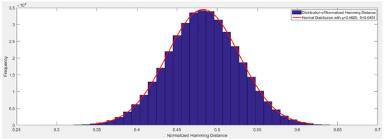 To evaluate the anti-collision performance of image hashing, 696 hash codes are generated via the proposed PIH scheme, based on 696 test images from the CVG-UGR image database [41]; following this, 378,400 normalized Hamming distances are calculated between the hash pairs of different images. The histogram of the normalized Hamming distances is shown in Figure 4. One finds that the distribution of the normalized Hamming distance proximately obeys a normal distribution with a mean of μ = 0.4825 and with a standard variation of δ = 0.0451. Consequently, given the threshold , the collision probability can be computed as follows: